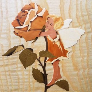 Assemblage des bois de placage en paquet, découpage à la scie à chantourner, assemblage et collage sur une toile tendue.